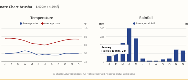 Arusha is the town closest to the most popular northern parks and has a comparably mild climate. The peak amount of rainfall in April is considerably less in most parks than in Arusha. The Ngorongoro Crater rim receives quite a lot of rain and is very cold during evenings and mornings due to its high altitude (about 2,300m/7,545ft). Lower-lying parks, such as Lake Manyara, Nyerere (Selous), Mikumi, Ruaha, Gombe, Mahale Mountains and Katavi National Parks, are warmer than Arusha.